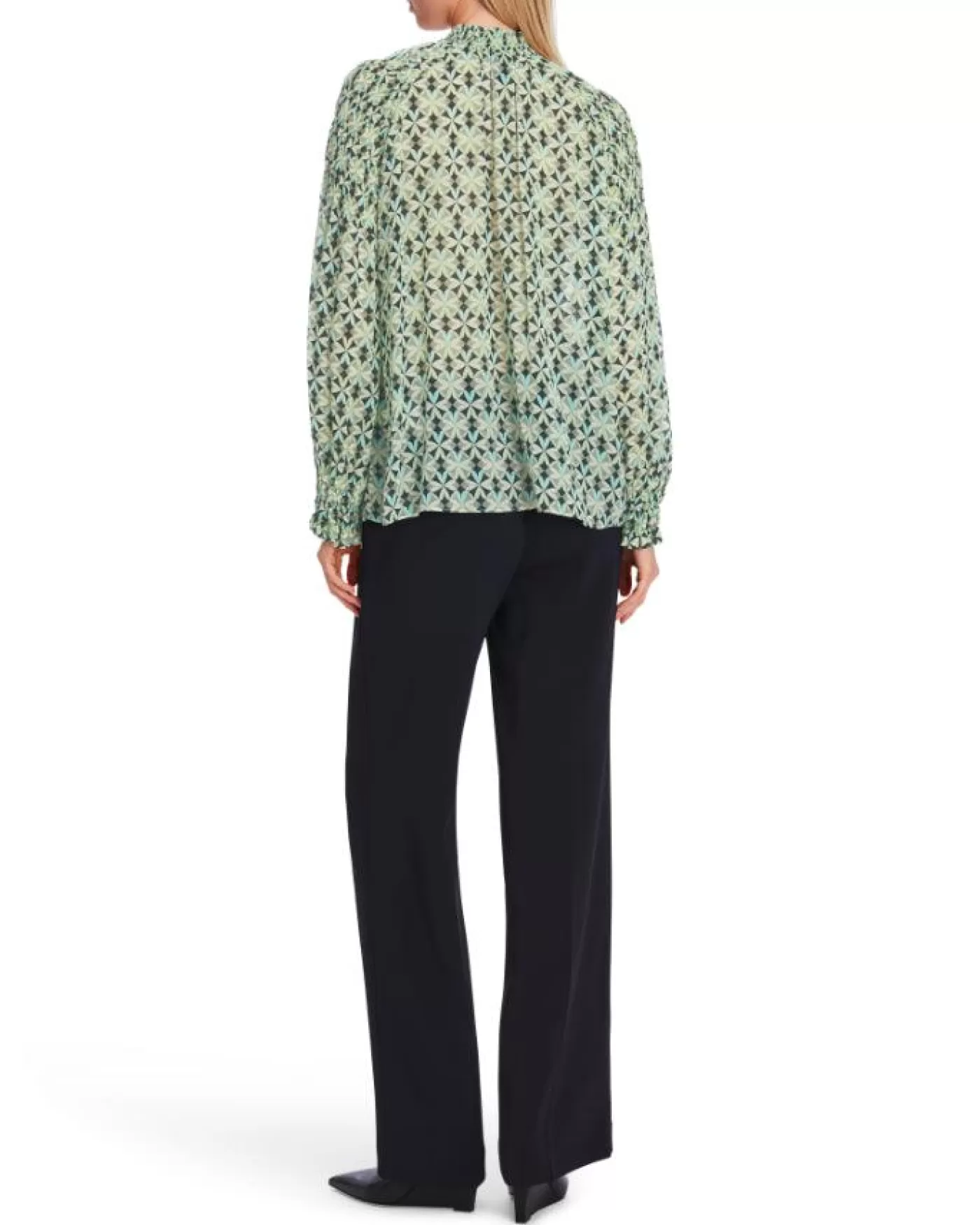 Marc Cain flowy geometric print long sleeve blouse with smocked round neckline and cuffs.