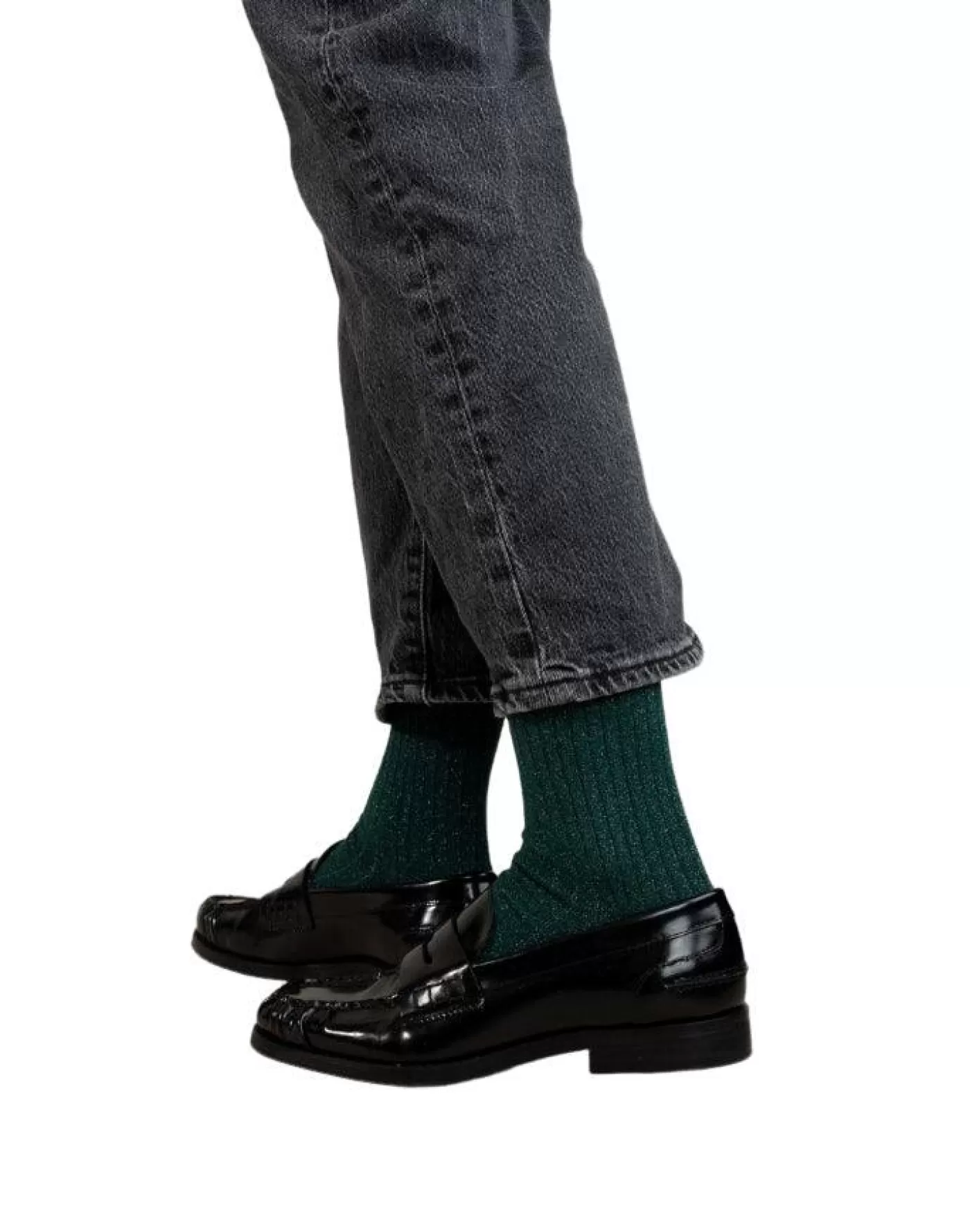 Bleu Foret glamour ribbed socks, a mix of cotton and shiny lurex thread, 100% cotton contact on the skin, reinforced heels and toes.